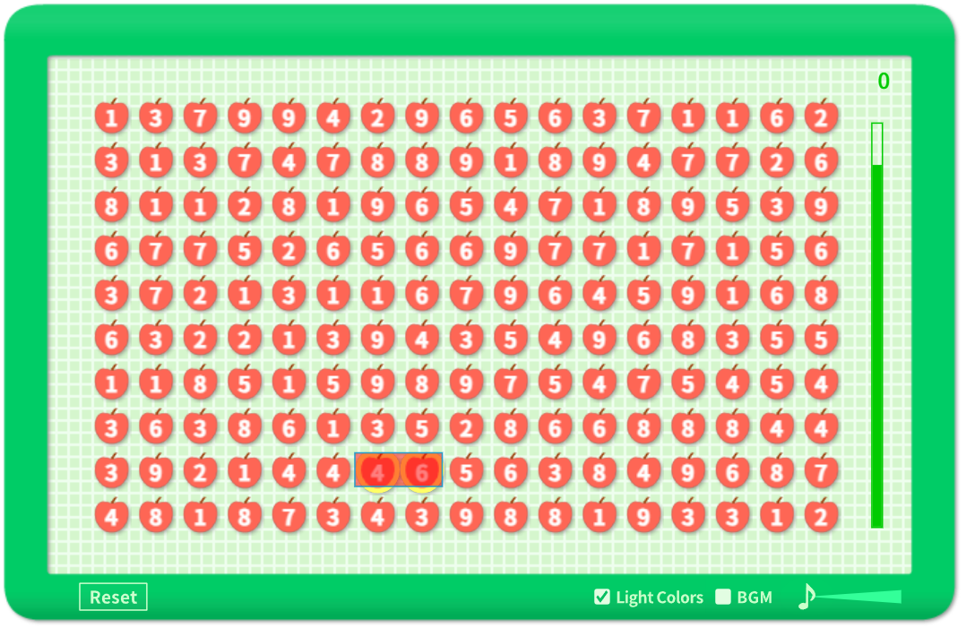 Drag the mouse to exactly enclose some apples so the numbers in the apples total 10. You get 1 point for each apple. The colors (apples etc.) will be lighter when checking "Light Colors". The game in this page runs on PC and mobile (iPhone,iPad